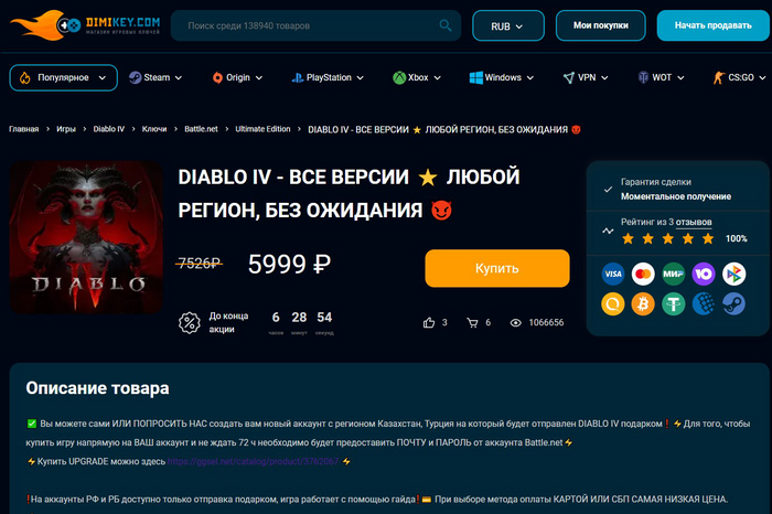 По просьбе пользователей, в этой статье я распишу подробную инструкцию о самых быстрых и удобных способах приобретения Diablo 4, обойдя все трудности, связанные с санкциями компании Blizzard по отношению к российским и белорусским игрокам. Покупка игры на свои старые аккаунты не даст доступ к Diablo 4, если ваш профиль имеет регион Россия или Беларусь, игра не будет отображаться в библиотеке, даже если использовать ВПН. Однако, существует решение - создать или купить новый аккаунт с другим регионом, на который не наложены санкции. Важно учесть, что возможно потребуется привязка номера телефона местного оператора соответствующей страны.