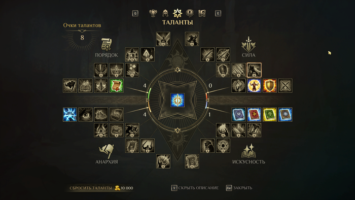 - Система идеалов. Основная "фишка" игры и один из самых больших недостатков. Классовая система, которая была в играх Катаури, по сути уничтожена - потому что каждый класс может изучить любые таланты, на которые хватит очков, но вот большинство из них залочены неким аналогом репутации. Здесь стоят две системы, которые собственно и отвечают за выбор в большинстве квестов - Анархия противопоставлена Порядку, а Сила - Искусности. По факту имеем 4 фракции, если можно так назвать, в Силу входят разные там звери (кроме собак) и дворфы, Искусность - о магических созданий больше (элементали, големы и т.д.), Порядок - юниты гвардии и "хорошие чуваки" , Анархия - нежить, бандиты и "плохие чуваки". Выбор к юнитам не так привязан, мне никто не запретил конвертнуть будто бы склонную к Порядку паладиншу в анархию и забить армию нежитью, но вот таланты - это важно. По сути в любом случае придется прокачать одну из альтернатив на максимум, другую - можно и по половине, всё равно, кажется, до последнего таланта в двух ветвях одновременно очков не хватает, но точно не проверял. Плюс в том, что таланты можно сбросить, хотя и не бесплатно. Но для условного мага ВСЕГДА придется качать мастерство, ибо сила ему тупо ничего не даст. От классов есть только центральное умение, которое по сути только меняет то, какие бонусы кто получит за поднятие уровня (по умолчанию, у мага - магические, у воина - боевые, у паладина - лидерство, с которым еще один момент расскажу позже). И вот если таланты можно переучить, то изменить сделанный в начале игры выбор, через который, например, не получится изучить последний талант магической ветви (вроде как там надо 28 очков, а за игру где-то 30+ можно получить), и это проблема. Не хочу долго задерживаться, но по существу без полной переделки системы все очень и очень печально.
