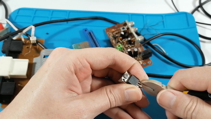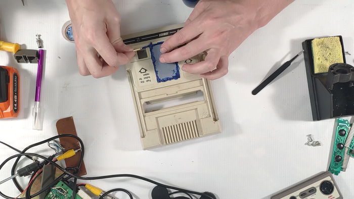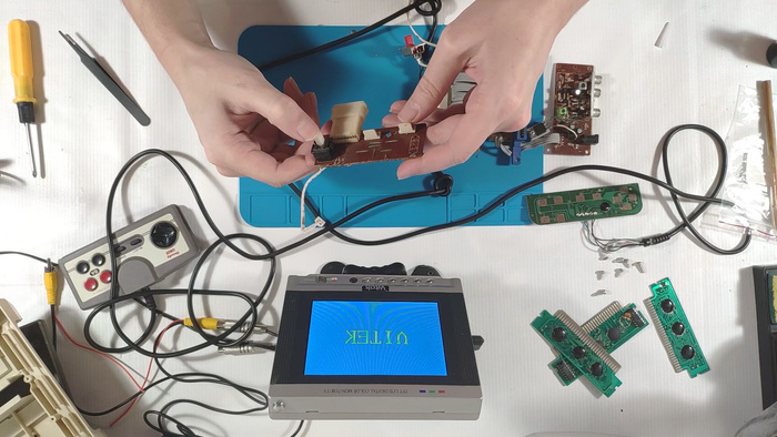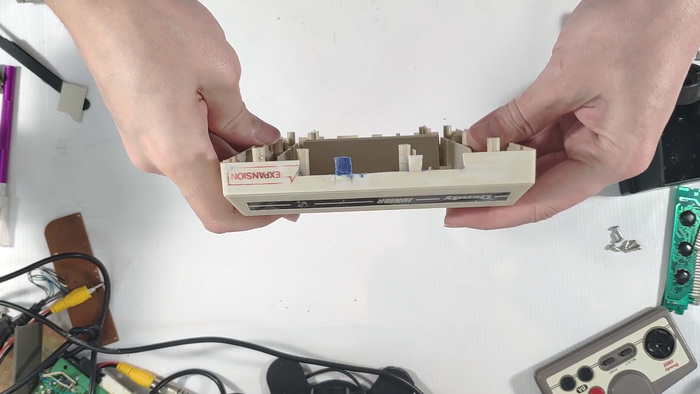 Схематично второй генератор выглядит очень странно. На деле это не совсем генератор... С видеочипа на него приходит частота 900КГц, которая раскачивает второй кварц на пятой гармонике и уже эта частота усиливается транзистором и подается обратно в видеочип. Забегая вперед, скажу, что запустить эту часть схемы я так и не смог. Кварц никак не хотел раскачиваться. Может сам кварц не подходит для этой схемы, может погрешности номиналов обвязки не вписали в допуски... Не знаю. Вместо этого чудо-решения поставил обычный генератор на одном транзисторе и каких-либо проблем с цветом не возникло. Позже на SECAM-версии схемы увидел точно такое-же решение, только там была продублирована схема основного генератора. Далее по списку идет аудио-видео часть. Оригинальная схема предлагает безальтернативный способ вывода картинки - ВЧ модулятор для подключения к телевизору. То есть нет ни композитного видео, ни раздельного аудио выходов. Решается это довольно просто, достаточно добавить в схему, так называемый, AV мод. Со слотом картриджа тоже случилась засада... 24 пинового разъема с шагом 2,54мм приобрести не удалось - местные магазины оценивают его в неадекватные 500-600руб, а на Ali штучно не продают, только партиями по 5-10 штук. Поэтому было решено использовать разъем с шагом 3.96мм, который достать гораздо проще. По факту, приобретать оригинальные картриджи я не планирую и особой разницы нет для какого шага травить самодельный картридж.