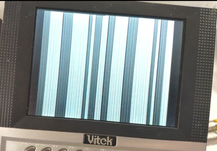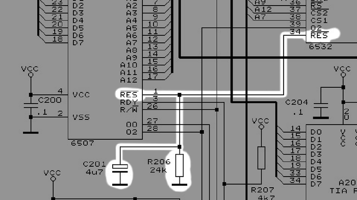 Сначала запаял тактовый генератор и проверил его работу. Далее второй "генератор-усилитель" и необходимую для первого запуска мелкую обвязку. После установки TIA не обнаружил частоту поднесущей цветности... Но это влияет только на цвет, с этим разберемся позже. После установки всех остальных чипов первая попытка включения. Ну, и кто-бы сомневался, что она не увенчается успехом. На мониторе появился черный экран, это значит, что какой-то сигнал все таки есть и это не могло не радовать. Но исправная приставка при включении без картриджа должна показывать рандомные вертикальные полосы, которых не было. Еще несколько вечеров ушло на полную прозвонку схемы и вдруг.... Причина нашлась после очередного обращения взора на схему. Инверсный выход RESET процессора был посажен на землю! То есть ЦП постоянно находился в режиме сброса. Сверка с другими схемами подтвердила этот косяк, автор либо подключил резистор не туда, либо забыл поставить еще один подтягивающий резистор.