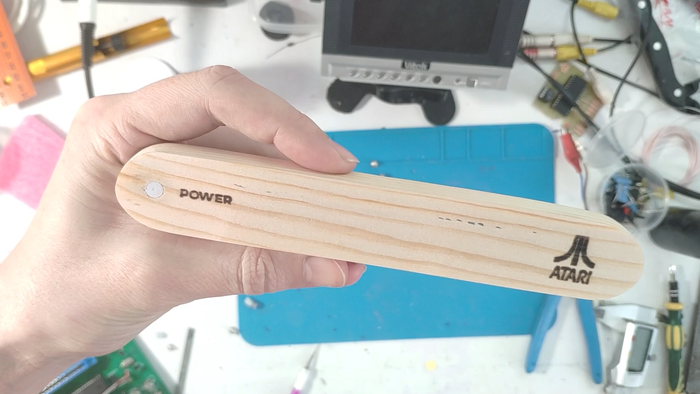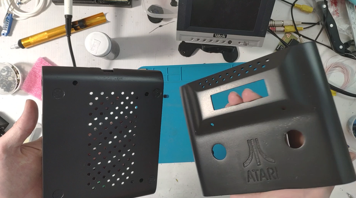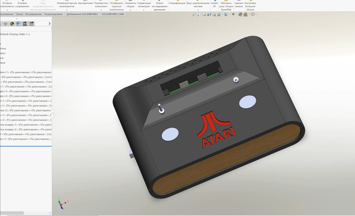 Законченному продукту просто необходим презентабельный внешний вид. Продумывая концепт корпуса, я старался делать отсылки к самой первой ревизии консоли. От нее была взята башенка и передняя деревянная вставка. Весь корпус был спроектирован в SolidWorks и отправлен на печать.