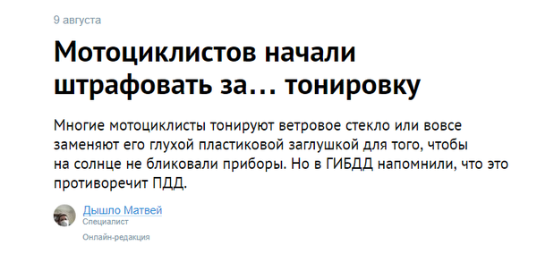 О том, что ветровое стекло мотоцикла для закона ничем не отличается от ветрового стекла автомобиля, напомнили в ГИБДД Тольятти. Там на минувших выходных провели рейд, в ходе которого кроме семи водителей автомобилей за тонировку были оштрафованы и водители двухколесных транспортных средств (2 мотоциклиста и 2 водителя скутеров).