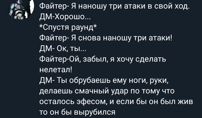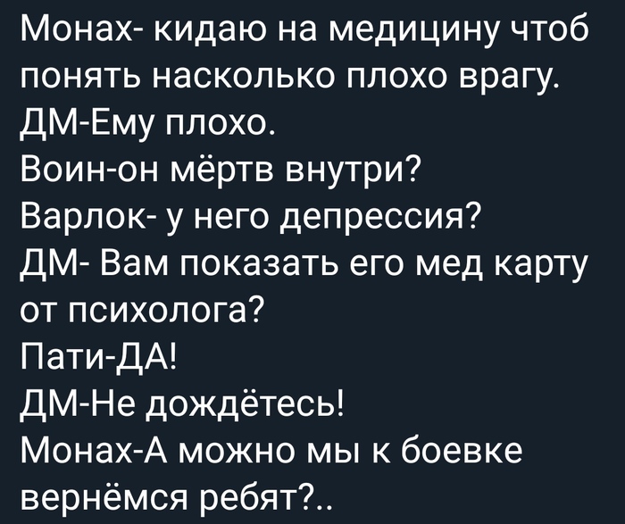Финальная боевка в пещере, выставляется сильный моб, так как все три игрока забронированные консервные банки. И на случай невезучести игроком, в луте ранее выдал камень призыва элементаля (Заклинание призыва элементаля 5 уровня). Этого бы с гарантией хватило что бы схлопнуть босса, ну и заодно познакомить их с различной механикой. Но нет - мы знаем что нас ждет босс, у нас есть чем его свалить - значит отдых нам не нужен! Совместными геройскими усилиями ( помощью ДМа, что бы не сдохли раньше чем надо) босс помирает, предпоследним ударом уронив паладина в нули. Что бы тоже познакомить с механикой. Первый бросок на стабилизацию проваливает. Я подробно им описываю ситуация, как можно стабилизировать тело. Что мы делаем? Геройский вопль ЛУУУУУУУУт какой выпал?.