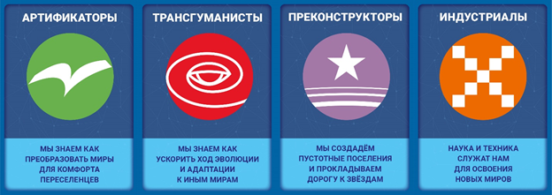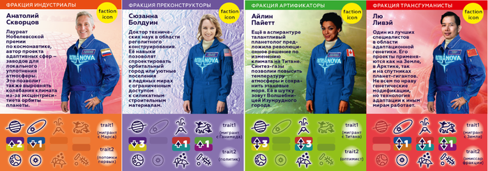 В распоряжении игрока (или игроков) 32 космонавта, принадлежащих 4 разным фракциям.