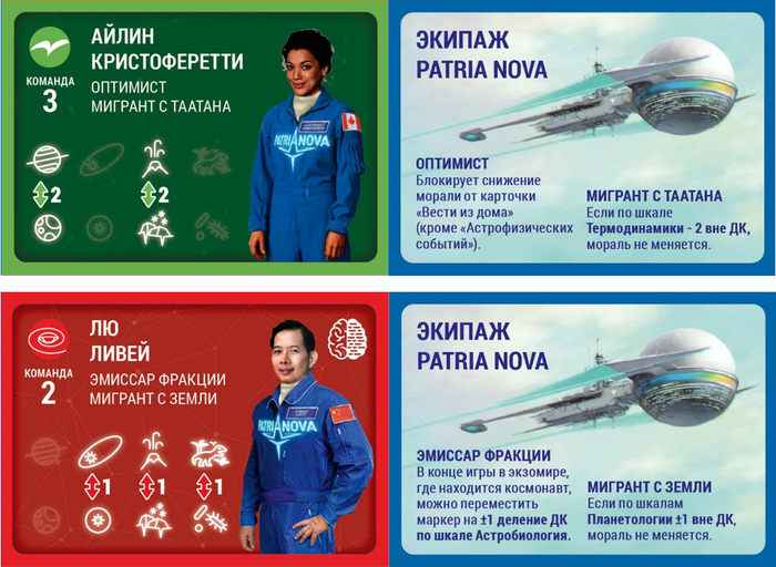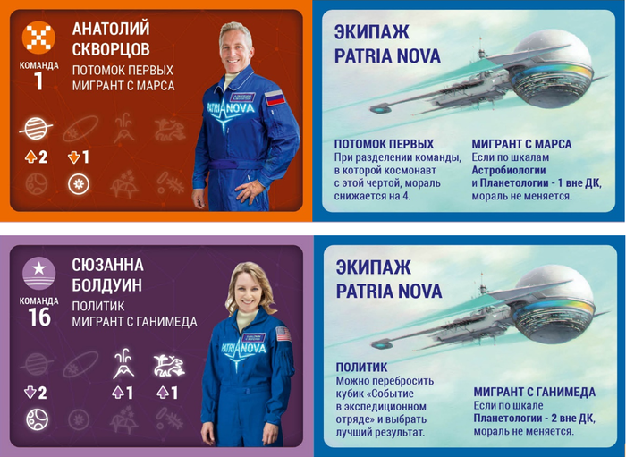 Текущий дизайн карт космонавтов-исследователей (т.к. выбор космонавтов «вслепую» это достаточно редкое игровое событие, был выбран дизайн, направленный на уменьшение формата карт с переносом описания навыков и черт характера на рубашку.