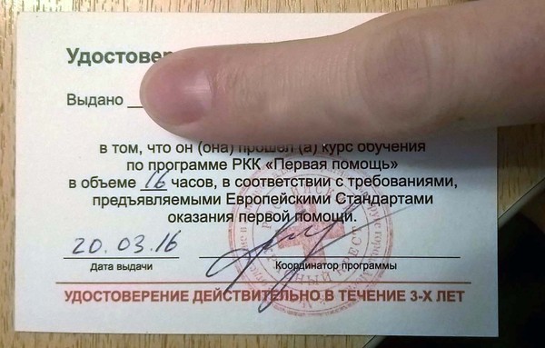 По окончании курса вам выдадут удостоверение о том, что вы окончили курсы первой помощи. Выглядит оно вот так (рука не моя :)):
