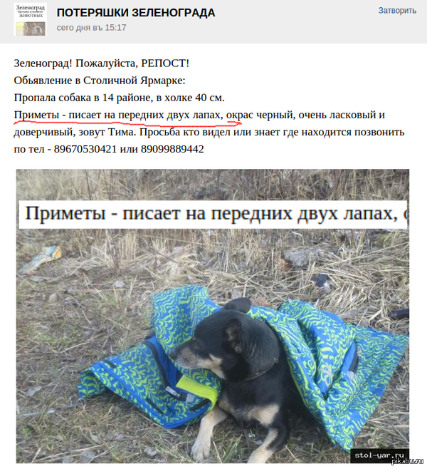 0 HyperMol Особые приметы 10 лет назад Такого точно не забудешь П.С.: Телефон не удалял с картинки - вдруг, и впрямь найдется Юмор Приметы Собака Объявление