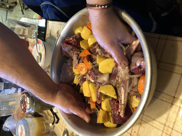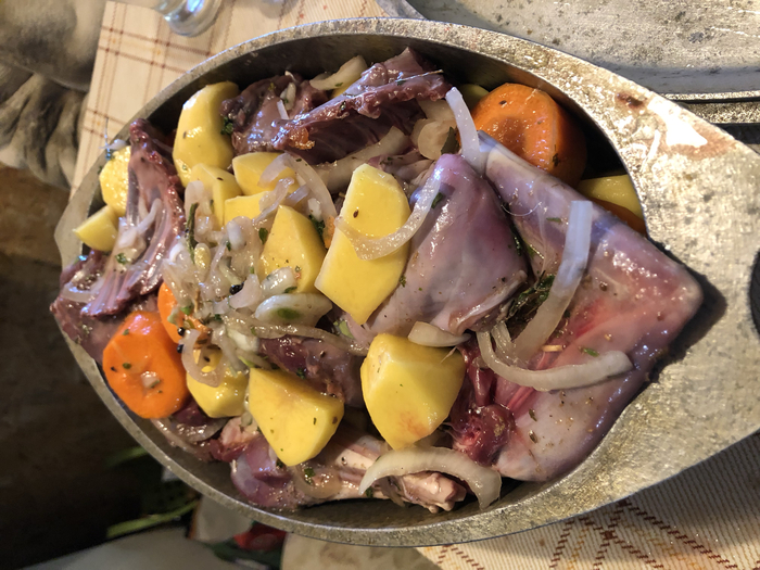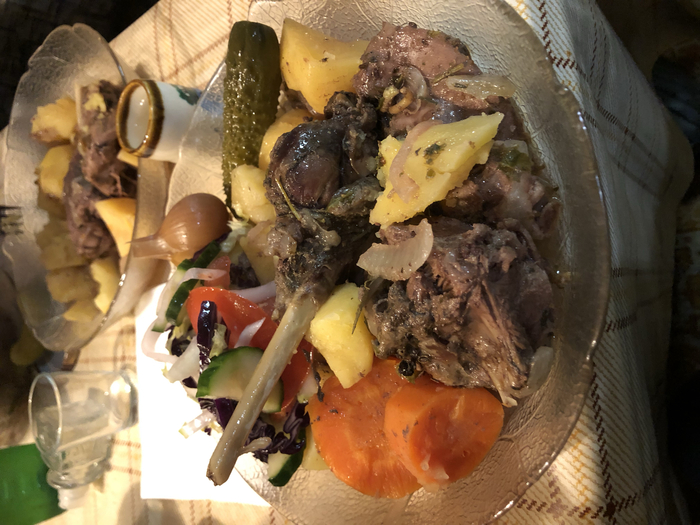 Готовили в утятнице, в дровяной духовке, с овощами и разными травками (какие точно кидали не помню, но можете сделать как у автора). Потребляли с самогоном!