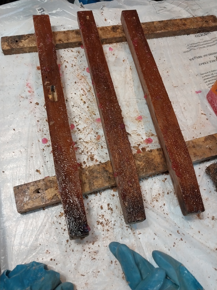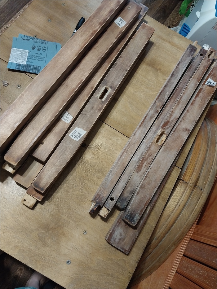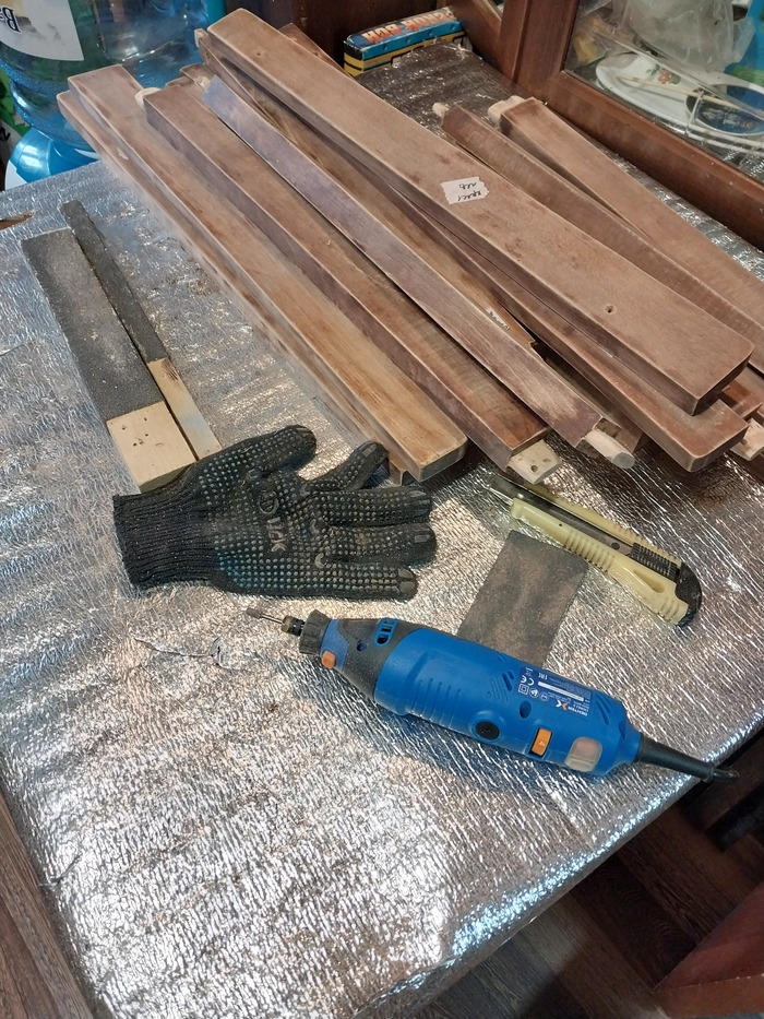 Так как они были в разы светлее, то сначала я покрыла их морилкой. Водной, конечно. Под акриловый лак. Затем тоннированным лаком оттенка "тик" всю поверхность. И потом ещё бесцветным для прочности покрытия, а также устранения одного нюанса тонированного лака - всем хорош, только небольшая липкость после высыхания не проходит. И, собственно, результат работы.