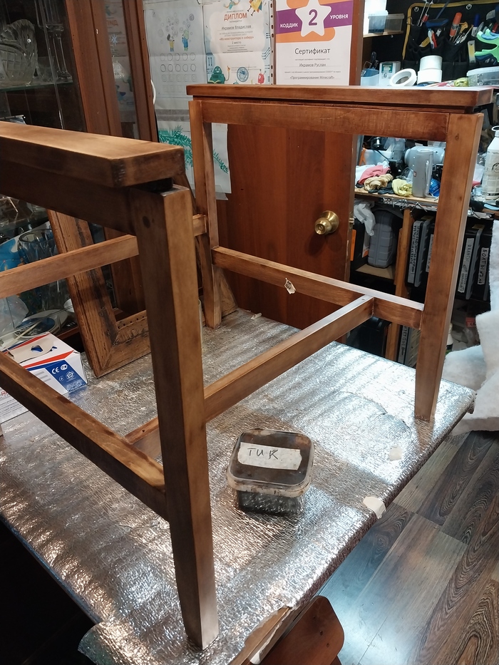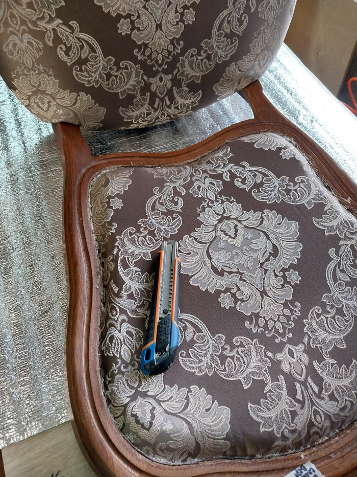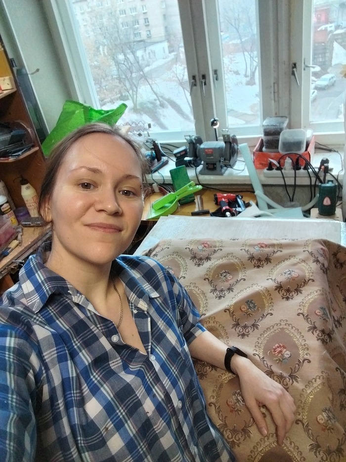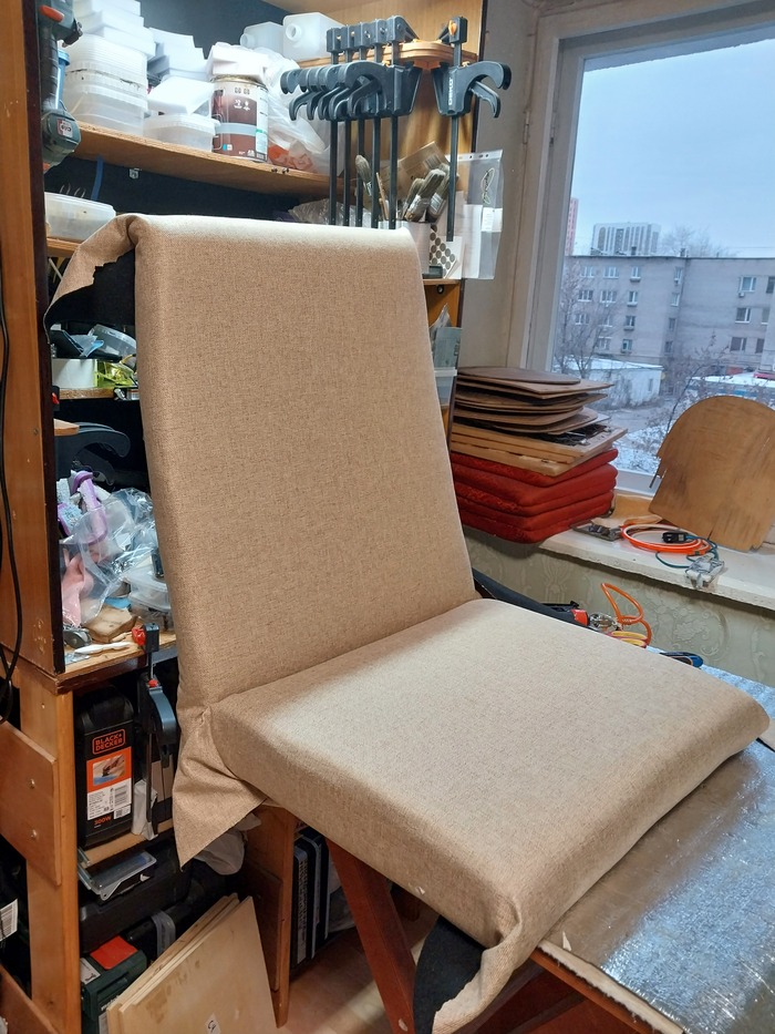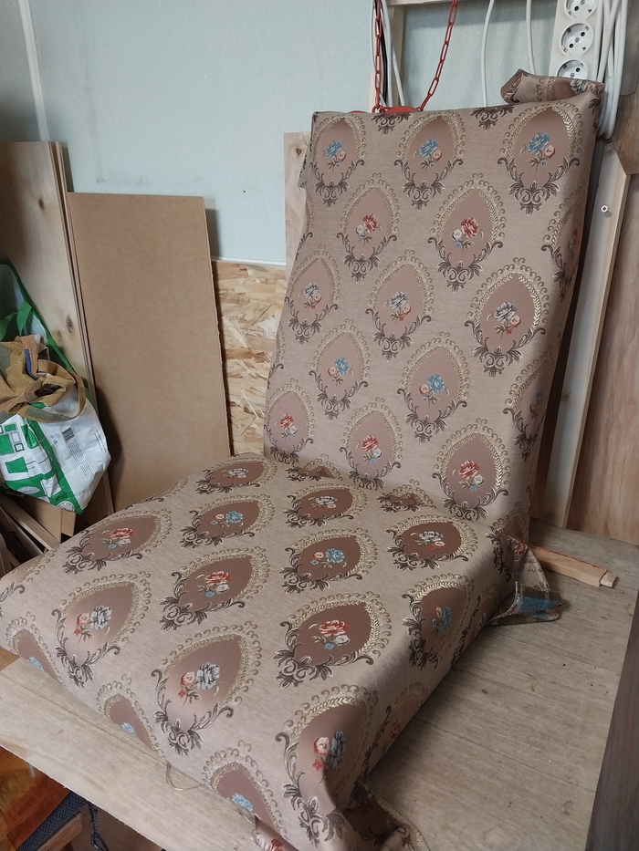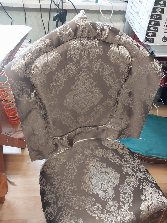 Ткань была была выбрана довольно специфическая, плотная. Спинка изогнутая. А форму тоже нужно было сохранить. И вот тут пришлось помудрить слегка.🤔 Ну, с сиденьем проблем не было особых, о чём может сказать моя довольная физиономия.😄