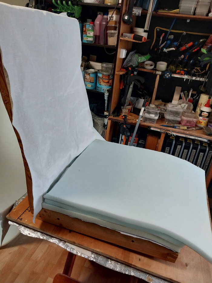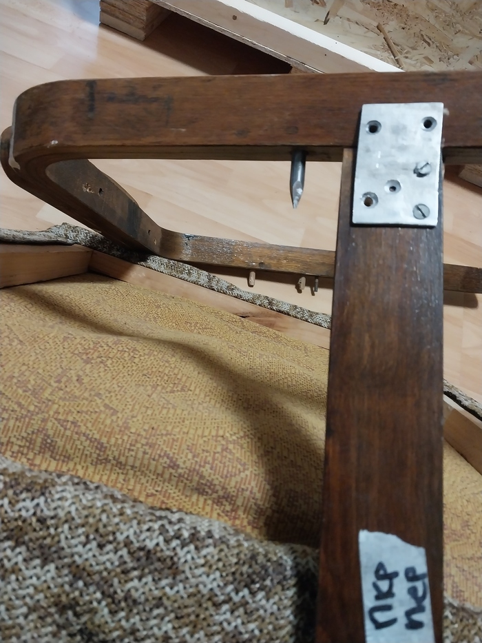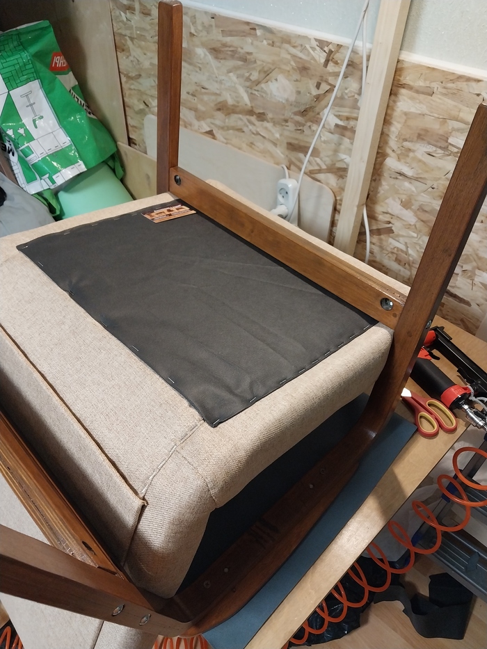 Итак, у кресла заменили резину, теперь вместо нее нетянущиеся стропы, поверх традиционно ткань, чтоб поролон потом не истирался. И, нужно было заранее решить вопрос с натягиванием обивки, чтобы выглядело все аккуратно и без лишних складок, что довольно сложно при цельном каркасе. В общем, вкрутили рейку в сиденье. Так и стропы вбивать удобнее стало - есть куда.