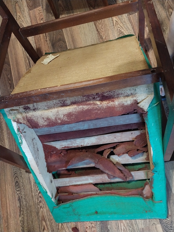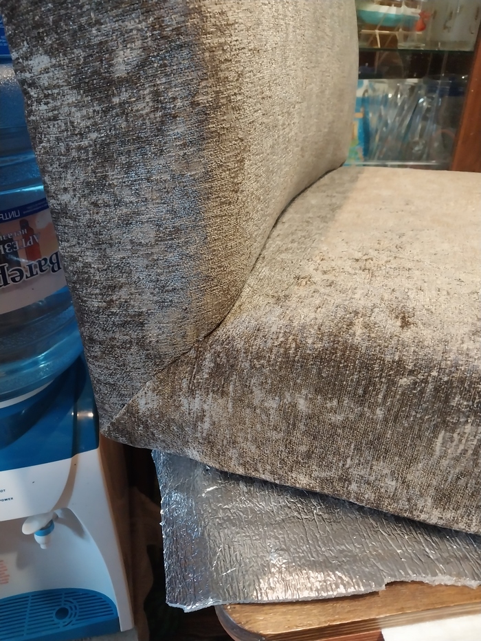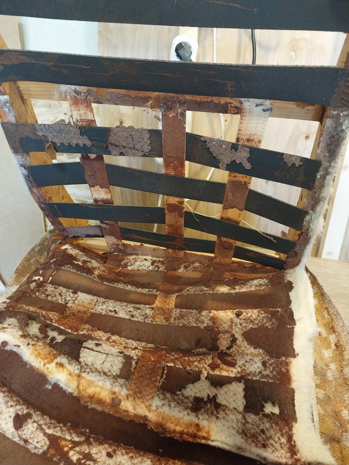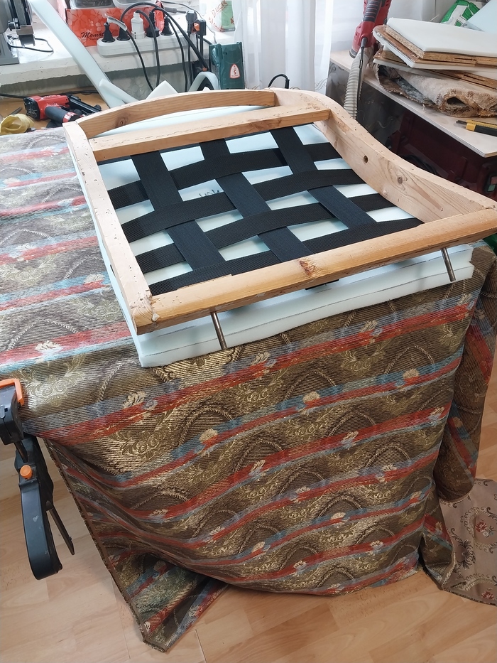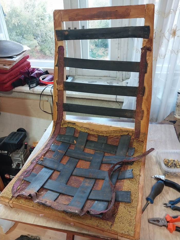 Как и положено, всё было почищено, каркасы переклеены, а резина поменяна на стропы. Имеются также мебельные ленты, но в некоторых случаях заказчики просят нетянущуюся основу. Сверху на стропы прибивается техническая ткань, которая предотвращает поролон от излишнего трения о стропы. Да и выглядит эстетичней с изнанки.😁