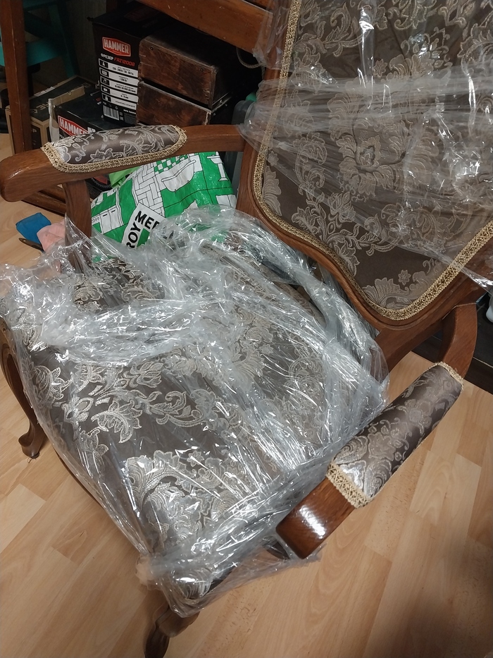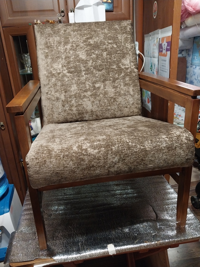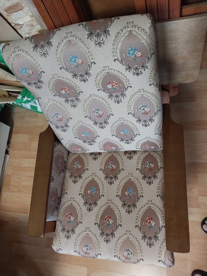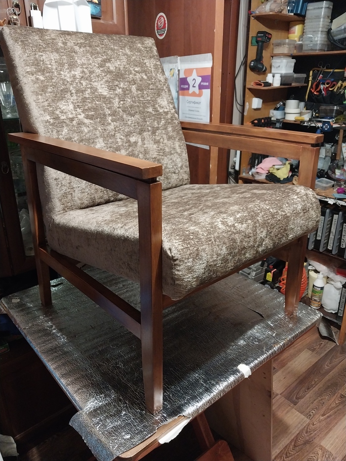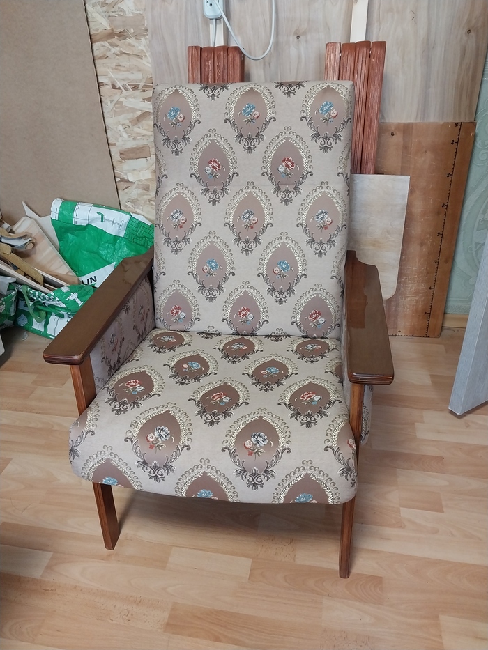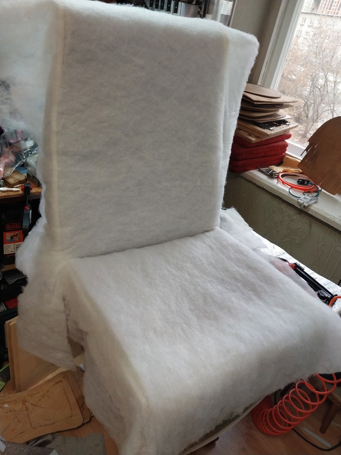 Сборка кресла - всегда самый приятный момент, но всегда самый удобный. Сзади на спинке была фанера, которую также нужно было оклеить тканью и прикрутить. Ну и спанбонд. Из-за конструкции кресла и то, и другое пришлось приделывать после сборки. Вот такое кресло получилось. Прикладываю также фото "до"