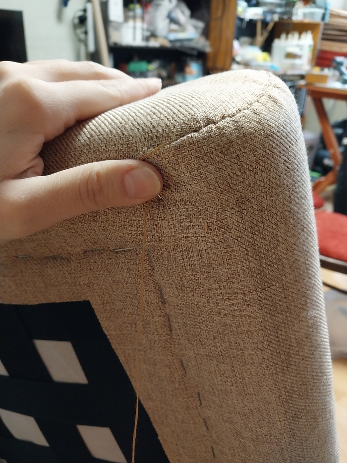 С тканью пришлось чуть помудрить, чтобы выглядело презентабельно и цивильно. В итоге, цельный кусок резали пополам и поочередно прибивали сзади, и уже после этого натягивали ткань спереди (сверху) и по бокам. Чтобы уголки выглядели аккуратно, я их прошивала, этакая иллюзия чехла, но на самом деле, да, выглядит лучше, чем завернутый поролон, и прослойка мягкая сохраняется, чтоб не зацепиться и не травмироваться случайно (ну, всякое бывает).