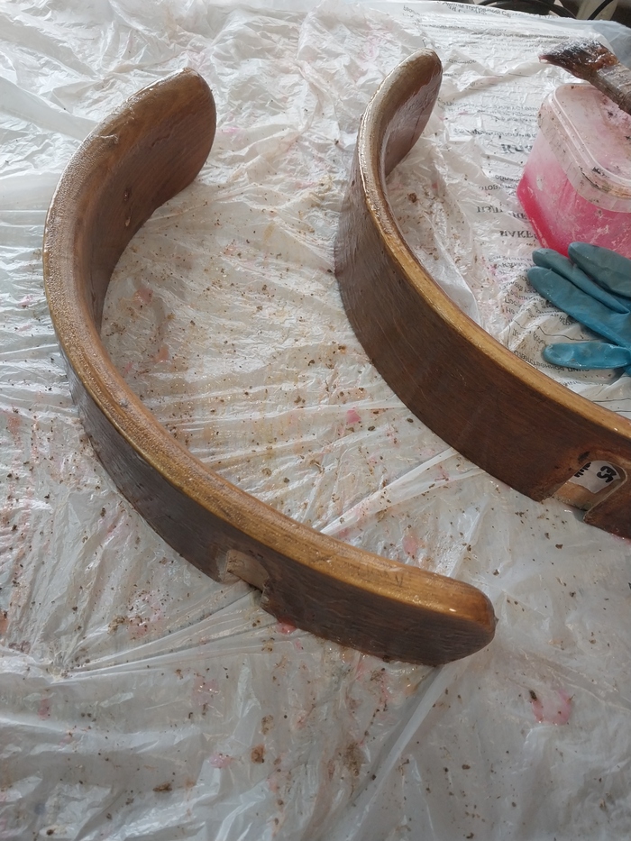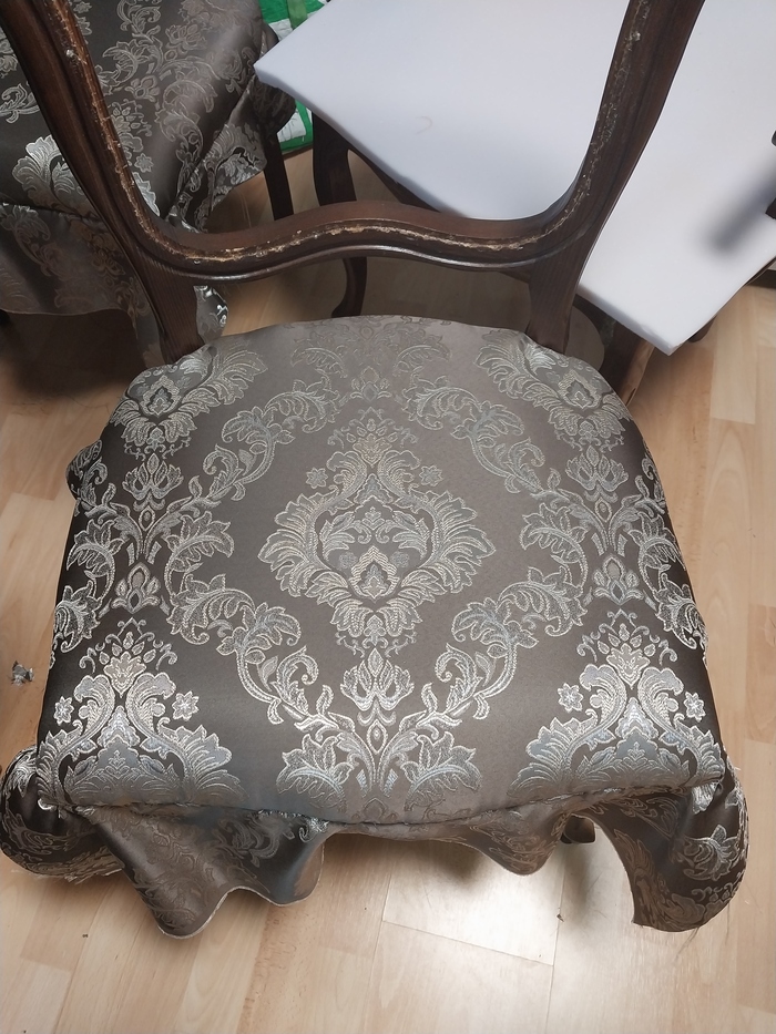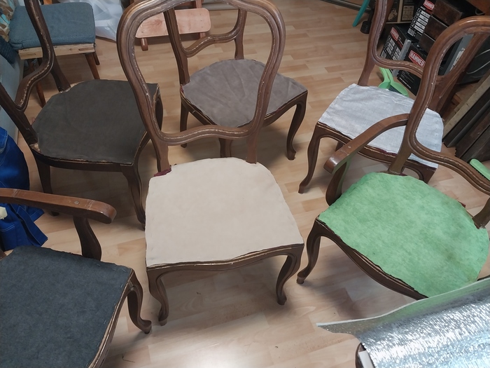 Все были расшатанные, потрепанные временем; трём из них также пришлось менять сиденья на новые. Старое покрытие было довольно светлого оттенка, и изначально предполагалось, что в обновлённом виде будет плюс-минус так же. Но... Заказчица выбрала уже другой оттенок, классический, после выкраса. Фурнитуру тоже пришлось заменить на гнутых элементах.