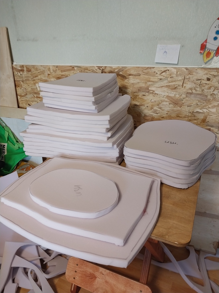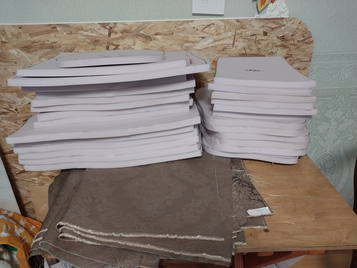 Дальше нарезка поролона, синтепона, ткани... Потом все это забивалось и подшивалось по краям.