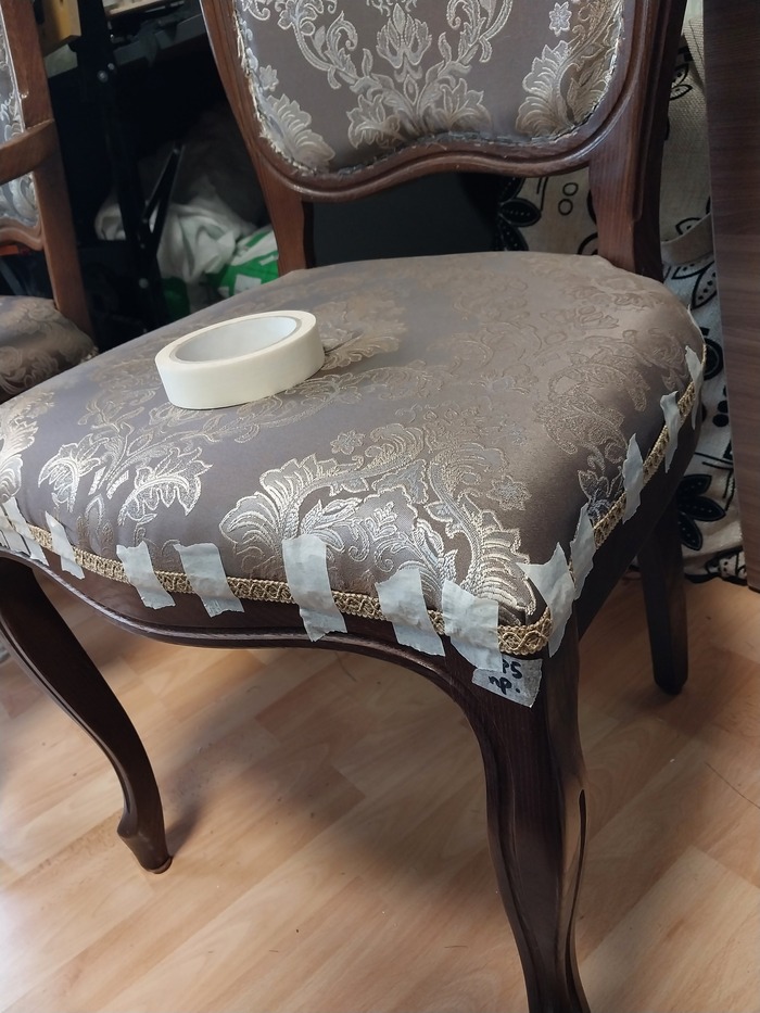 Для декора краев и чтоб спрятать скобы есть два варианта, с каждым свои сложности: молдинг+гвозди или тесьма. На свои стулья заказчик пожелал тесьму. Приклеивалась она на пва столярный, прозрачный.) Клеит хорошо, следов не оставляет при должной аккуратности