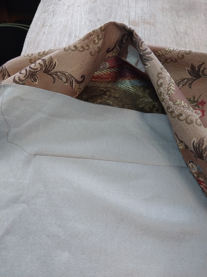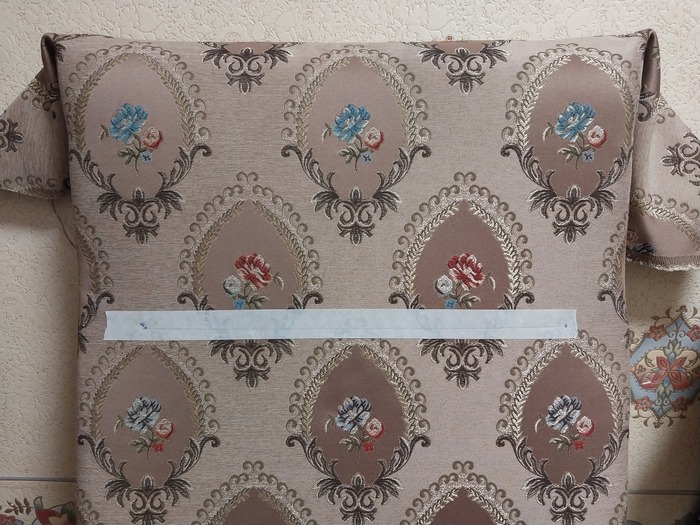 Отставим лирику и вернёмся к нашим баранам спинке. Ткань получилась натянутой, требовался шов, но мне показалось, что он категорически не будет смотреться на такой ткани и с таким рисунком. Вызвали заказчицу на совещание, благо живёт неподалеку. И услышала: "Делайте шов, главное, чтоб натяжения не было. Будет накидка на кресле." Сказано - сделано. Разметила, прошила. Подкладку пришлось прорезать, чтобы её прибить к каркасу. Ну и то, что примерно получалось, но ещё без шва.