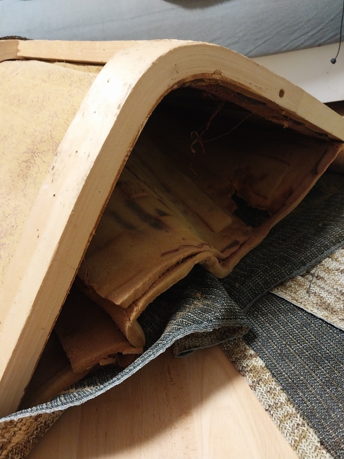 Переклейка - не проблема самс по себе, вот только обивка наружная. Чтобы разобрать эту прелесть, нужно сперва снять обивку с сиденья. А это непросто: под тесьмой скрывалась тонна скоб, вбитых глубоко и качественно. Правда, справедливости ради, со спинки обивку снимать было много тяжелее. Кромка узкая, одно неловкое движение и можно повредить деревянный край спинки.