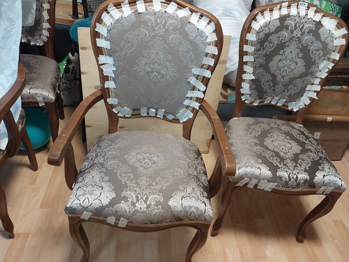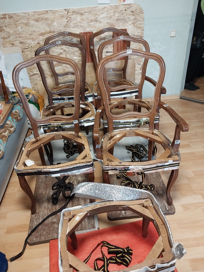 Такой радости было 8 штук: 2 стула с подлокотниками, как видите, на них тоже обивка имеется, 5 стульев без подлокотников и банкетка. Все сиденья на лентах с подкладками. А новая обивка делается на собранные изделия и никак иначе. Поэтому сначала у нас были переклеенные скелеты (даже не в шкафу)