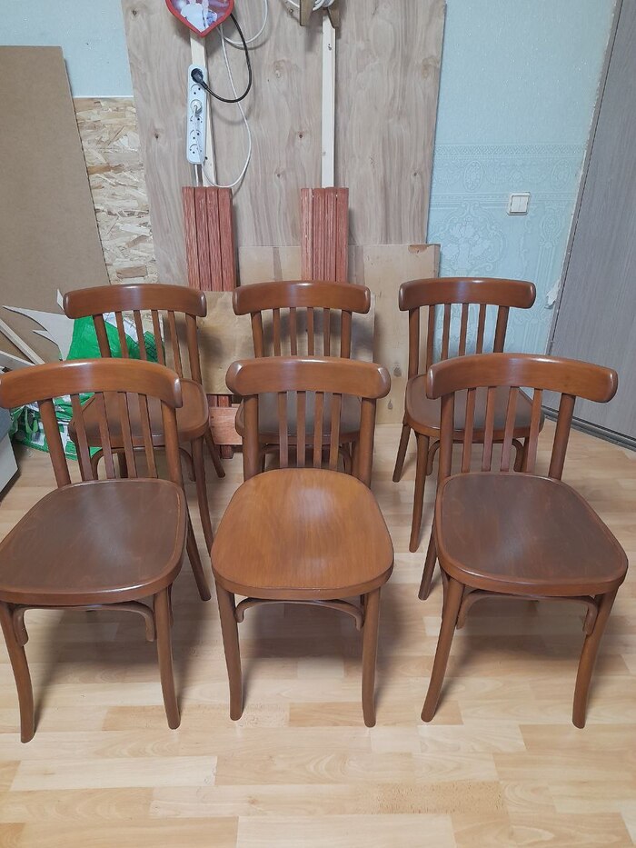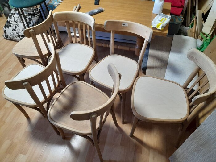 Много разной работы, и, если честно, не до описаний бывает совсем. Из последних работ - закончили на днях - комплект из шести "венских" стульев. На самом деле комплект из пяти, шестой другой модели, но заказчик один, поэтому считаем всё в одно😁. Записала в кавычках, потому что общепринятое название гнутой мебели. Не много кто вникает, что данные экземпляры могли быть также произведены в Чехословакии или вообще в Самаре. Но это всё - лирика. Итак, вот в таком виде "пациенты" поступили к нам: