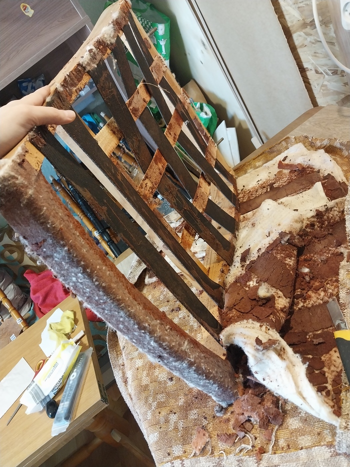 Как обычно бывает, при разборе пришлось тонну гвоздиков отковырять и выгрести уйму наполовину сыплющегося - наполовину пластилинового поролона.))