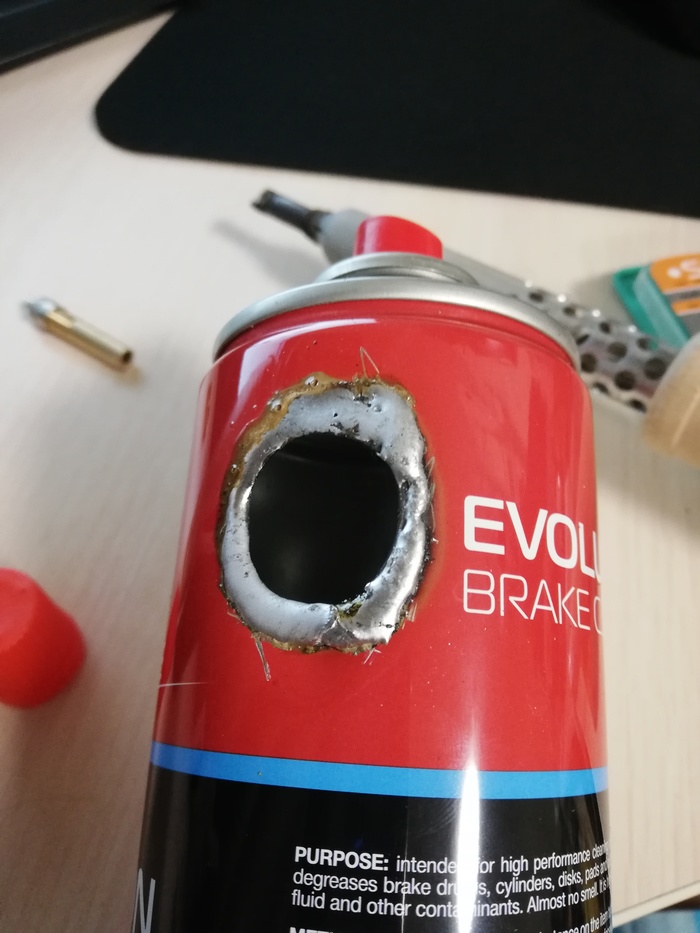 Из инструмента: газовый баллон с горелкой, припой ПОС-61, паяльник желательно на 100 Ватт, канцелярской нож и сверла. Я делал все одном сверлом - конусным, оно же морковка. Нужно проделать два отверстия и сразу залудить края, одно диаметром 20 мм для заливки материала в баллон, второе 7 мм для ниппеля (соска), чтобы накачивать давление. После сверления баллон необходимо промыть водой обильно, тем самым вымыв все остатки воспламеняющихся паров растворителя. Обязательно!