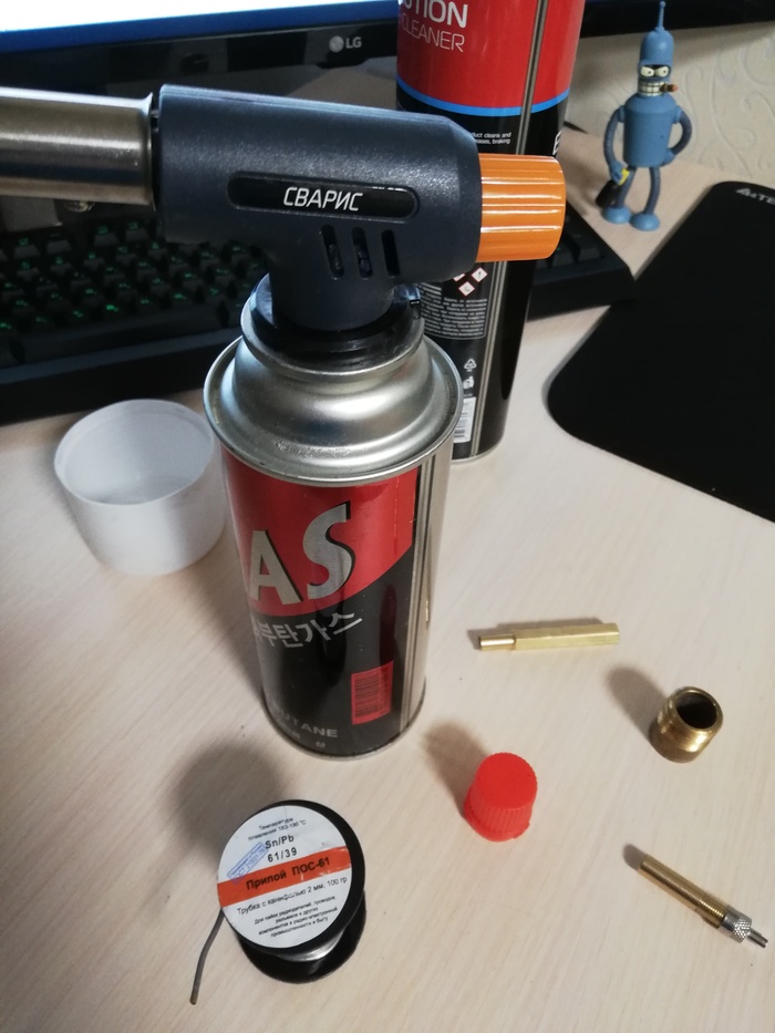 Дальше приступаем к впайке латуни в баллон, если еще ниппель можно впаять паяльником то латунный сгон паять только газом ( при пайке газом необходимо залить баллон водой дабы избежать оплавления внутренней арматуры т.к она пластиковая и вся оплавится ) потому, что паяльником не удастся прогреть нормально материал и припой не пристанет к стенкам.