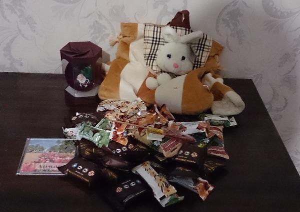 Обнаружили мы целый рюкзак-зайчик новогоднего настроения! Много конфет-суфле (мне можно, если сначала отдать мужу обгрызть шоколад))), петушок на палочке (он уже почти съеден, вкусный оказался, как в детстве!), ёлочная игрушка с Дедом Морозом и большущий магнитик! Вау!!! Дорогая Ляна из города Армавир, знай, ты просто волшебная Снегурочка! Рюкзачок я отложила для дочки, конфеты точно не доживут до конца праздников, а магнитик нашёл своё законное место на холодильнике