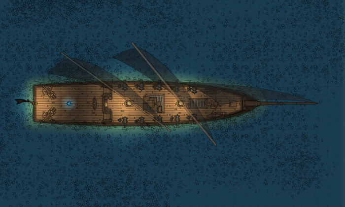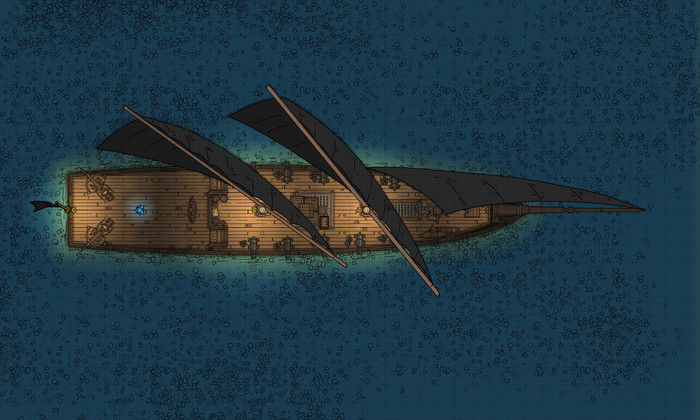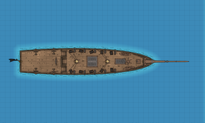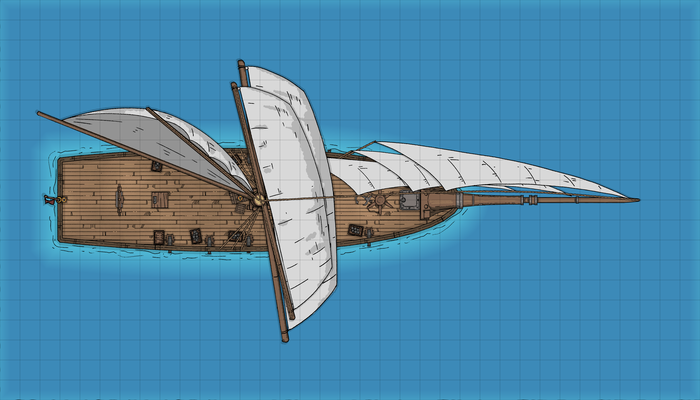 Собственно, перебрал багалу, заменил черные паруса на простые белые, заменил пушки, убрал кристалл (он не нужен для стандартного корабля), добавил пару баллист, развернул их, добавил нижнюю палубу и такелаж. Даже сортир есть. Фон, правда, пришлось упростить, так как клонирование слоев работает через пень-колоду, а вручную всё повторять нет никакого желания.