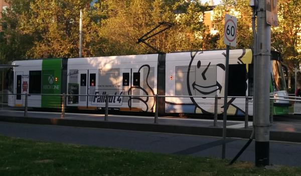 ^"Hype Tram Fallout 4" - трамвай-рекламный продукт Fallout 4 запущенный в Мельбурне, Австралия. Авторство фотографии за пользователем Reddit - DogRavi.