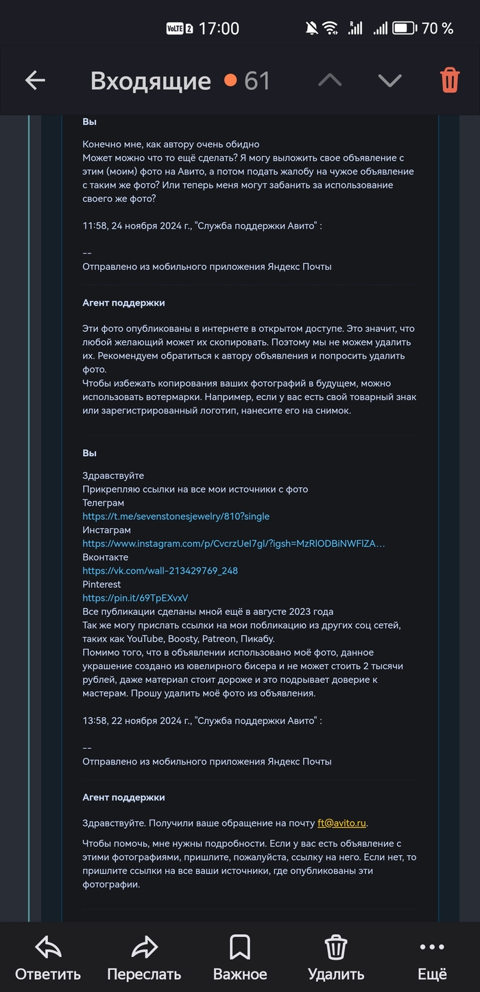 Ну и я отправила обращение в поддержку Авито прикрепив ссылки на оригинал по праву первой публикации, но спустя 3 дня мне никто не ответил(