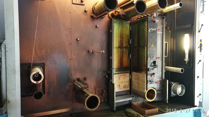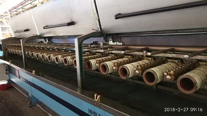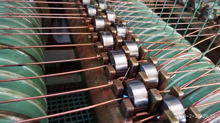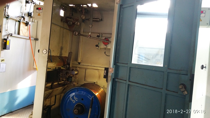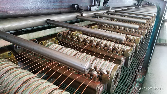 Но это не конец)) После волочения, медь становится жесткой и пружинистой, ее нужно сделать мягкой и гибкой, поэтому далее она попадает в так называемый шкаф отжига меди. Здесь все проволоки проходят по токопроводящим роликам, т.е. на ролики подается нехолое напряжение, отчего медь нагревается и становится мягкой. После токопроводящих роликов она попадает в шкаф охлаждения и сушки, а далее уходит в приемник на каташку (борт 630).