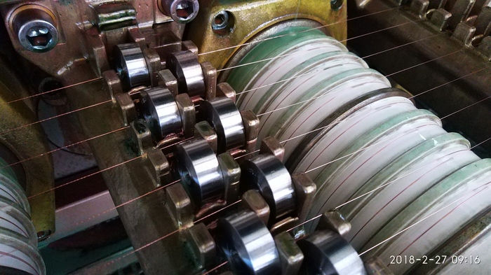 Входной диаметр проволоки 1.80 мм, после же всех 22 волок она уже становится 0.18мм. Ну это смотря от заказа также, если нужна 0.40 или 0.50, то соответственно я снимаю не нужные фильеры, а если опять понадобится те же 0.18, я со всеми матерями и на всех языках начинаю снова плясать с бубном и заправлять фильеры, мать их ети.