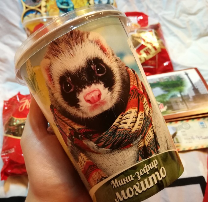 А вот что внутри: два вида необычных зефирок ( никогда не видела таких), конфеты, набор открыток, магнитики и декоративная тарелка