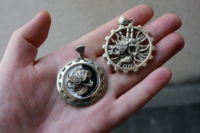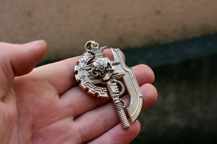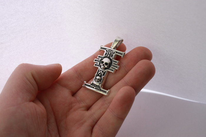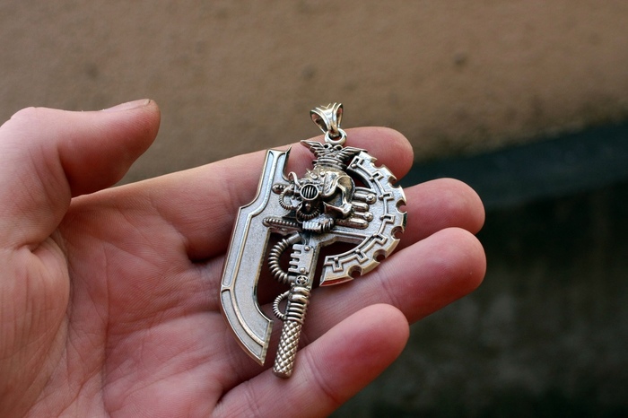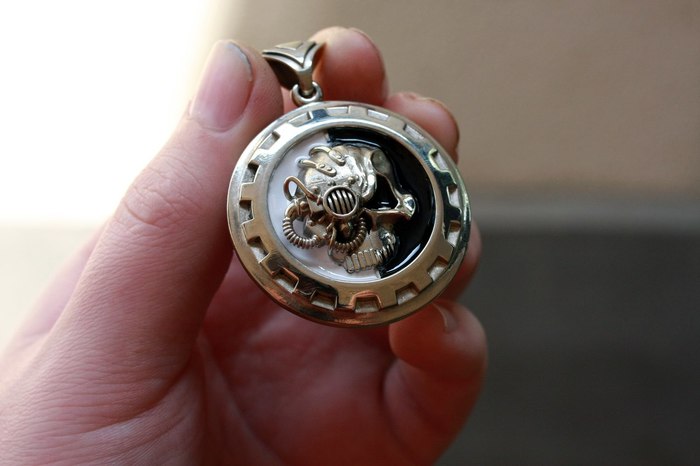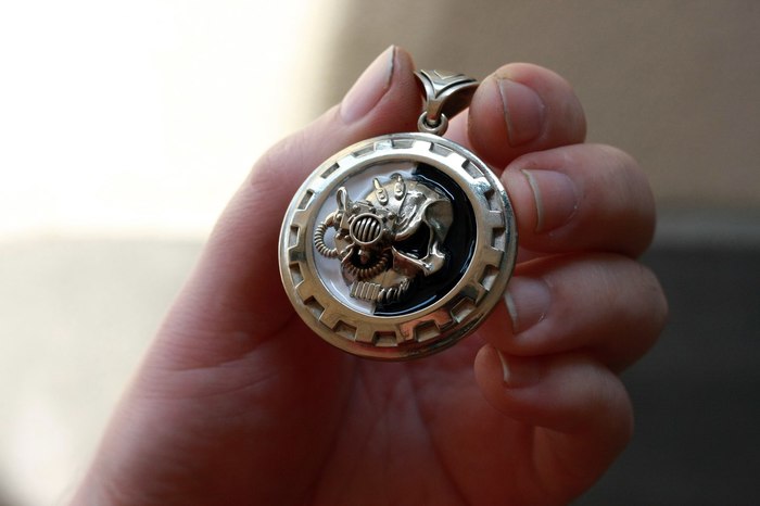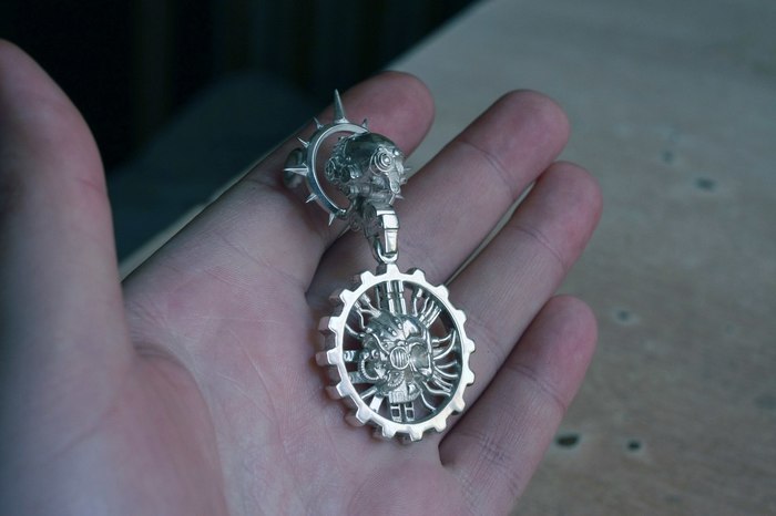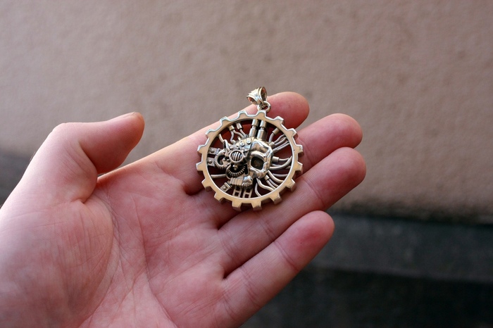 Здравствуйте . К изделиям на тему Адептус Механикус добавился ещё один необычный экземпляр . Это Кулон Рунный Круг Железных Жрецов . Железные Жрецы — это разновидность технодесантников , существующая только в ордене Космических Волков. Материал Серебро 925 пробы . Высота 5 см без учёта ушка . Вес примерно 50 грамм .