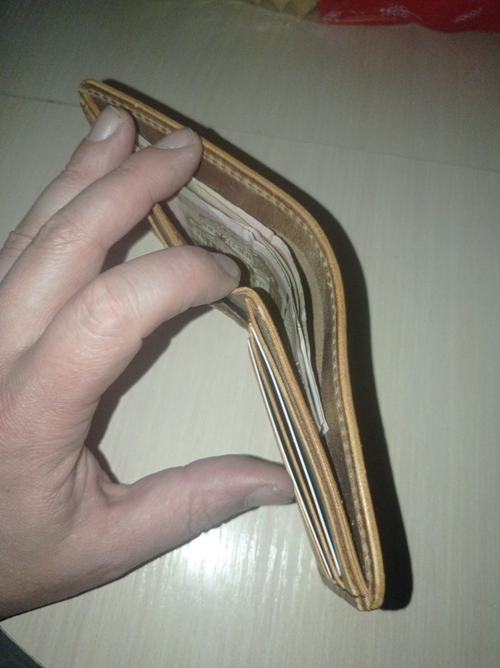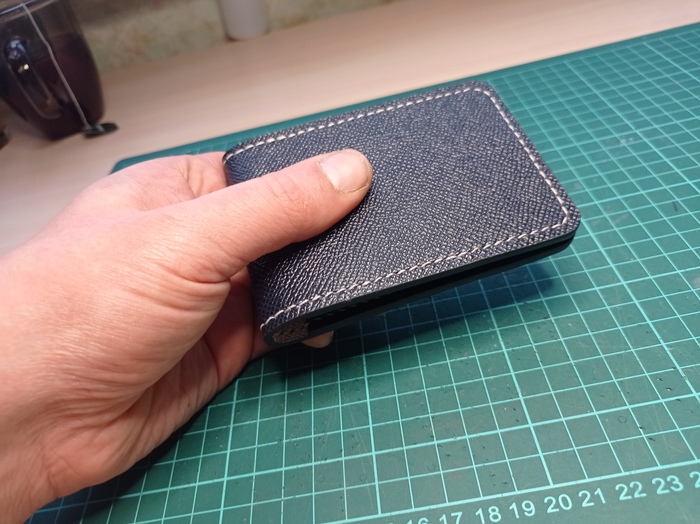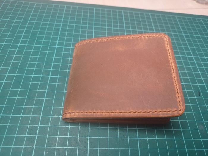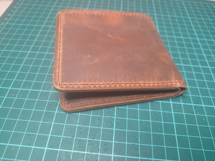 Такую тёмную кожу пробивать и шить - мучение, потому что на ней ни фига толком нн видно ни разметки, ни отверстий. Плюсом добавляется её фактура - еле видать разметку. Шов около середины почему то съехал и сверху и снизу, хотя размечал вроде одинаково всё. Урезы на хромке - то ещё приключение. Раза три или четыре наносил краску и шкурил потом из-за провала между слоями кожи. Вобщем - получилось то, что получилось))) Результатом почти доволен))
