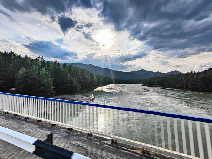 Путь начали из аэропорта Домодедово, откуда на небольшом, но полностью забитом, Боинге нас привезли в аэропорт Горно-Алтайска. Лететь примерно 4 с половиной часа, время отличается от московского, соответственно, тоже на 4 часа. Вылетели в обед, прилетели к ужину, удобно. Нас встретили, как обещали, и привезли в небольшую гостиницу, на живописном берегу реки Катунь. Путь пролегает через Чуйский тракт, о котором буду периодически рассказывать, потому что это действительно самая живописная дорога, по которой мне когда либо приходилось ездить.