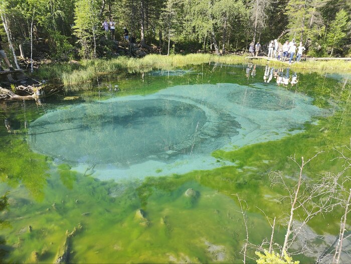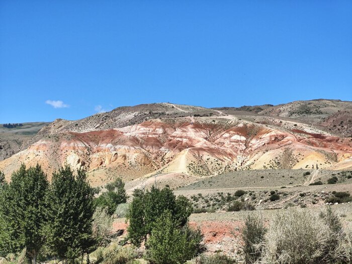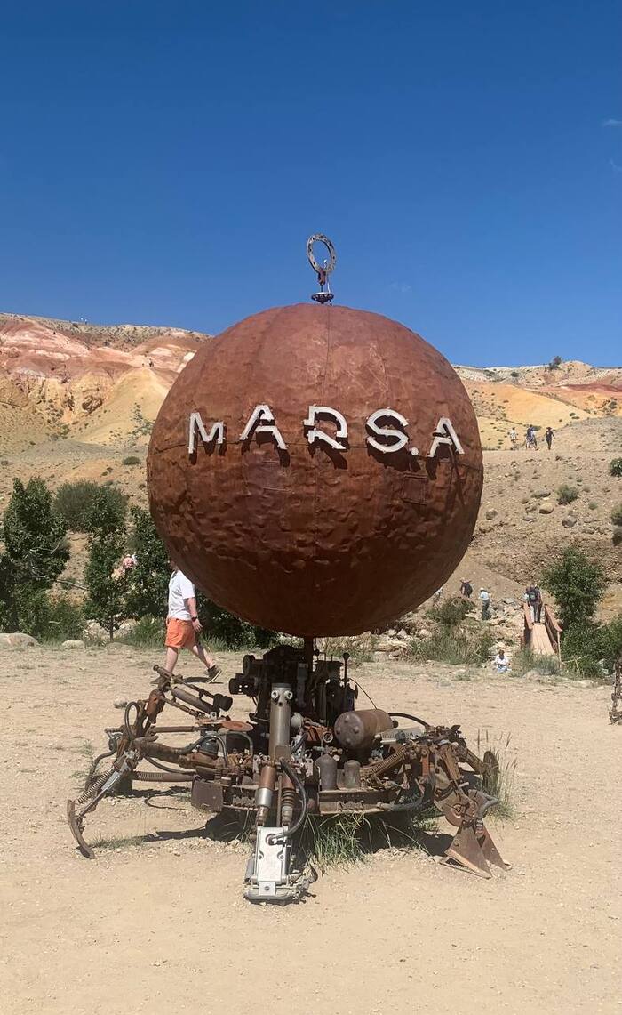Третий день начался с посещения гейзерного озера. Говорят, рисунок на дне постоянно меняется даже можно застать этот момент. В целом, озеро очень красивое, поскольку находится оно недалеко от трассы, то и туристов, его посещающих, огромное количество. Дальше была долгая дорога по Чуйскому тракту до Марсовых полей. Марсовых, очевидно, потому что они такого же цвета, как поверхность соседней планеты. Раньше там добывали вольфрам и ртуть, поэтому земля такого необычного цвета. Выглядит все очень красочно, особенно с высоты смотровой площадки. Правда, там очень жарко и очень пыльно, но оно того стоит, безусловно. Расстояния большие, поэтому в данный день удалось посетить не так уж много, однако устали мы очень.