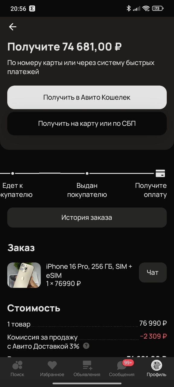 1 декабря 2025 года я отправил свой iPhone 16 Pro 256GB через Авито Доставку 70000000353991591 Покупатель его благополучно забрал, сделка закрылась, и в личном кабинете замигала заветная сумма — 74 600 рублей.