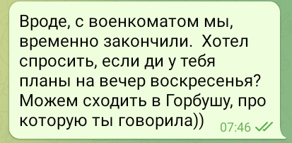 Я написал ей тем же вечером, сказал, что прекрасно провёл время и предложил увидеться ещё. Она согласилась и сказала, что у неё тоже есть желание увидеться, если это будет дружеская встреча...
