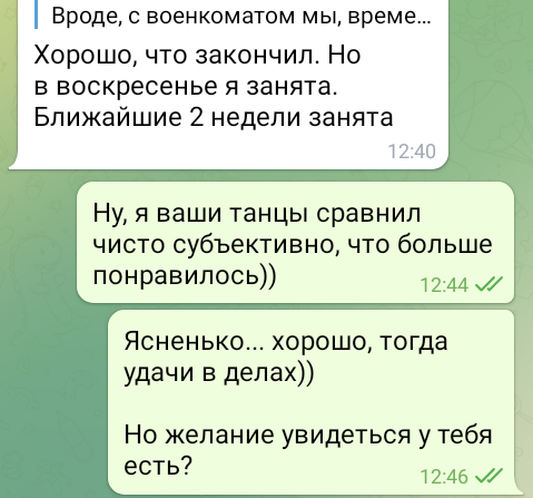 Ну, я ей написал в телеграмм, мол, плохо получается, со всеми дружу, а с ней одной нет и предложил встретиться. Она восторженно согласилась пойти в парк и кафе, так и сказав "Конечно хочу! Мне так жаль, что я не могу потом пообщаться с вами, ребята!"