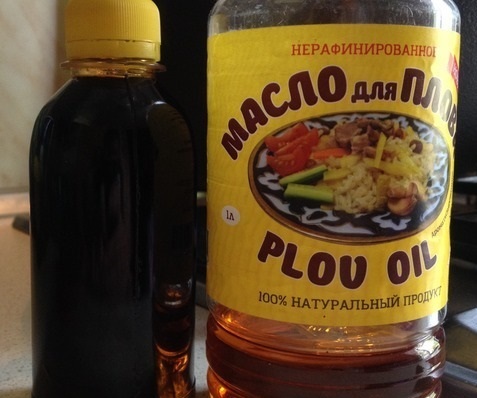 Когда казан нагрелся. Наливаем туда масло, предварительно смешав его в одной емкости. В Москве я эти масла покупаю на доргомиловском рынке. Мы все время будем готовить на сильном огне. Масло обязательно надо продолжить, чтобы немного сбить его запах кладём туда попку Лука, и сжигаем его до черноты. Как попка стала чёрной, вылавливаем её из казана.