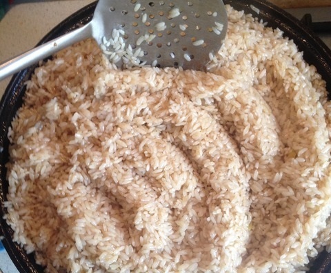 Прошло 35 минут, наш рис готов. Шумовкой рис уплотняем, дырочки скрываем. Огонь убираем и закрываем крышкой минует на 10-15.