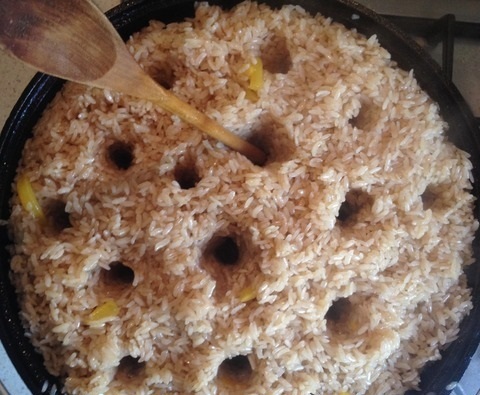 По происшествию 25-30 минут рис должен быть почти готов, вода почти ушла. И теперь мы делаем дырочки, чтобы оставшаяся воды выпарилась. Огонь остаётся сильным.