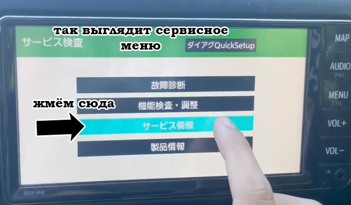 Сначала нужно зайти в сервисное меню магнитолы. Сделать это можно двумя способами, объяснять буду на примере магнитолы NSLN-W68 от Toyota Probox, модель магнитолы, кстати, тоже понадобится для восстановления кода, она написана маленькими белыми буквами на передней панели магнитолы.