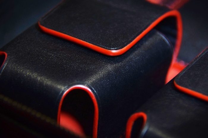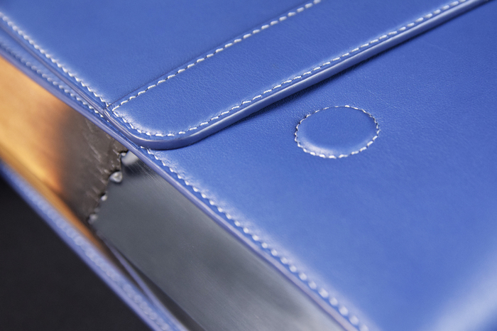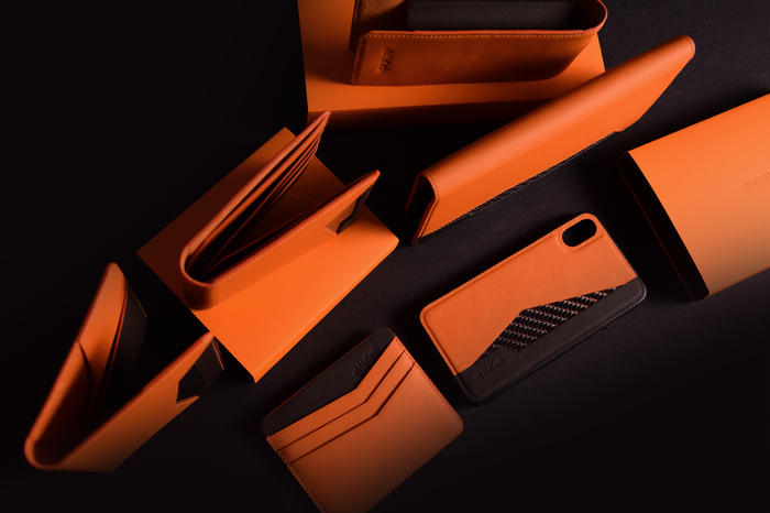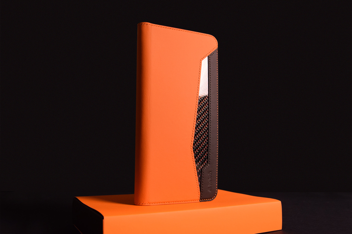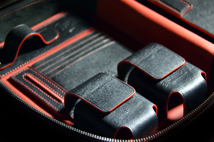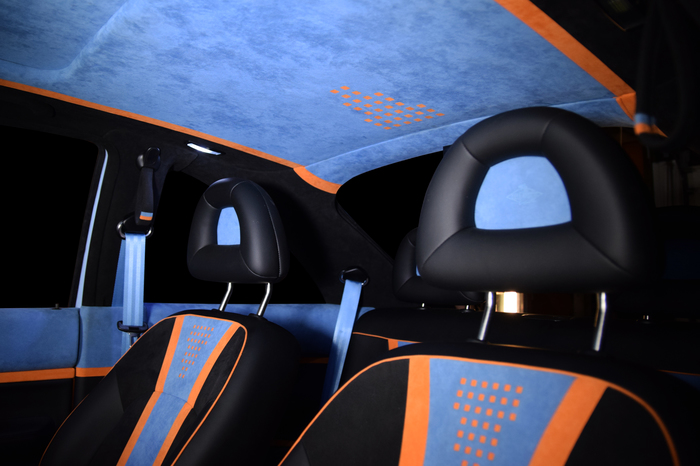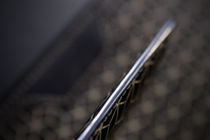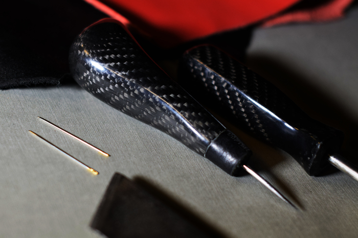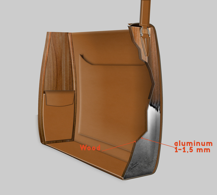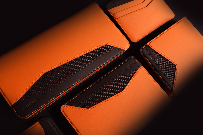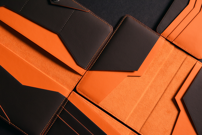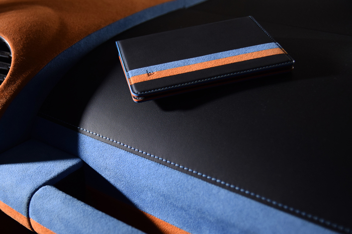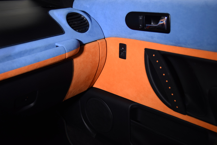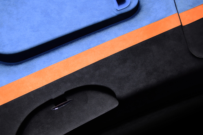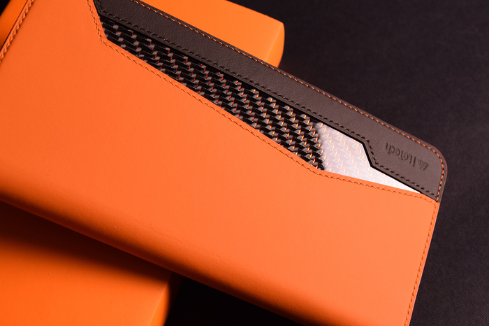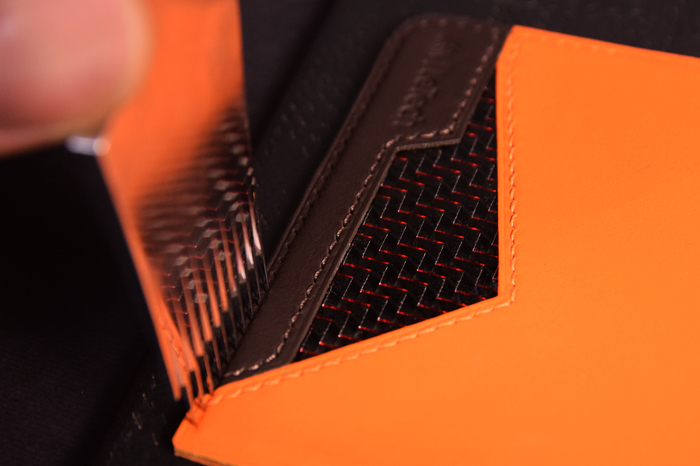 Основной материал - натуральная кожа из коллекции Lamborghini. Для подкладки использовалась оригинальная алькантара. В качестве декоративного элемента выступил карбон с очень интересным плетением.