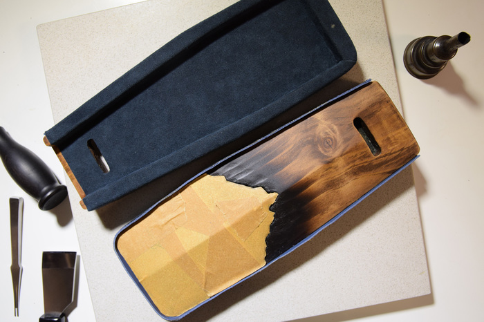 Было проведено много тестов с изготовлением карбоновых вставок, испробовано несколько видов волокна. В итоге пришлось отказаться от начальной задумки использовать оранжево-черное плетения т.к. при попадании на волокно смолы оранжевые нити превращались в красные.