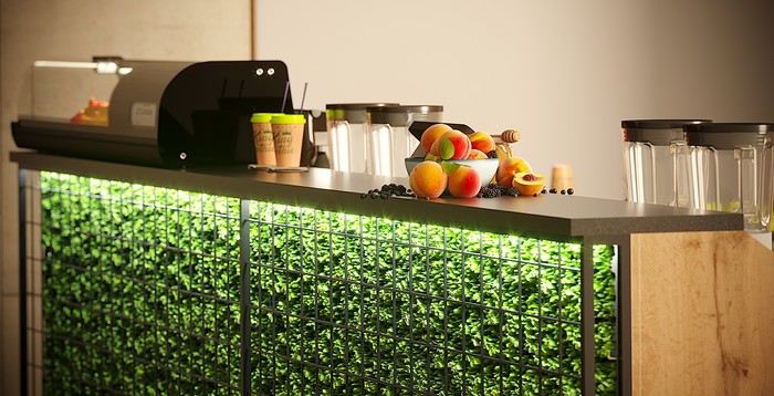 Хочу поделиться результатами работы над проектом острова "Король Смузи". Один из тех случаев, когда мой навык использования программ 3d визуализации стал конкурентным преимуществом. Напомню, я работаю менеджером в компании по производству торговой мебели.