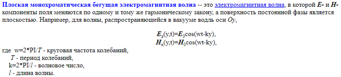 3. Астрофизик подставляет в первое уравнение "y = L" и получает, что напряженность электрического поля в точке L в любой момент времени равна E = E0 * cos (w*t - k*L). Отсюда он делает вывод, что свет распространяется с бесконечной скоростью, поскольку в тот самый момент, когда в далеком космосе появляется фотон, на Земле по изменению напряженности E = E0 * cos (-k*L) уже зафиксируют появление этого фотона. И это изменение напряженности можно даже использовать в хозяйстве, заставляя колебания электромагнитного поля вырабатывать ток в фотоэлементах.